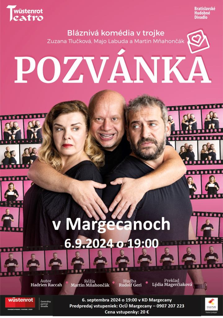 Obec Margecany Vás pozýva na zaujímavú komédiu POZVÁNKA v podaní hercov bratislavského divadla Zuzany Tlučkovej, Maja Labudu a Martina Mňahončáka 6.9.2024 o 19.00 h v kinosále Margecany. Vstupenky v sume 20 eur si môžete zakúpiť aj v predpredaji na obecnom úrade v Margecanoch – kontakt 0907207223
